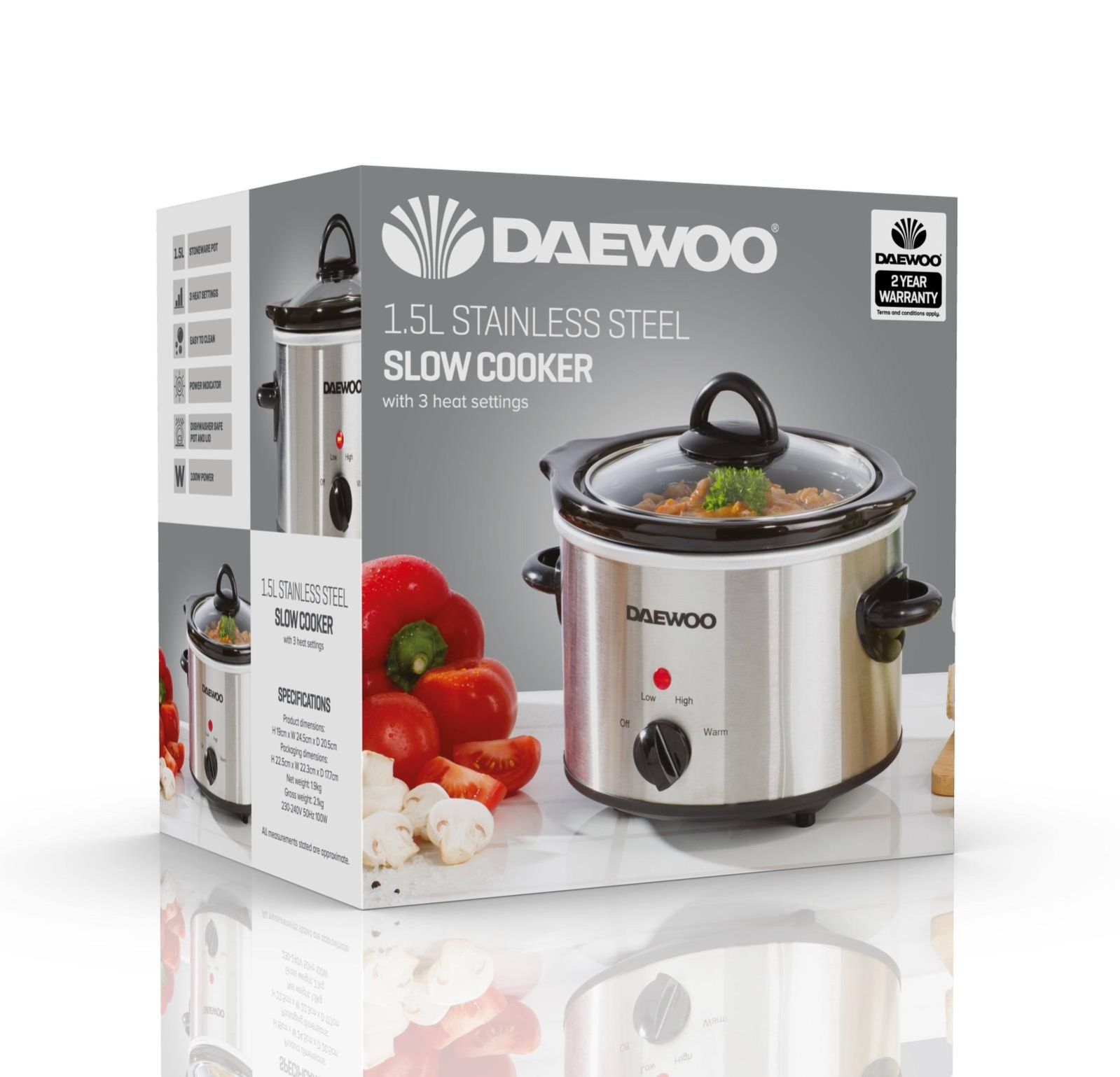 This Daewoo 1.5L slow cooker is the perfect addition to your kitchen for easy one pot cooking. With variable control over 3 heat settings, you can cook your favourite meals to perfection every time. Using less energy than other cooking methods, this 100W slow cooker is ideal for bringing down costs and making piping hot meals. Featuring a handy indicator light so that you can see the status of the cooker at all times, and 1.5 litre capacity. You won't have to spend a long time cleaning up either as the pot and lid are both dishwasher safe, making cleaning up after cooking quick and easy